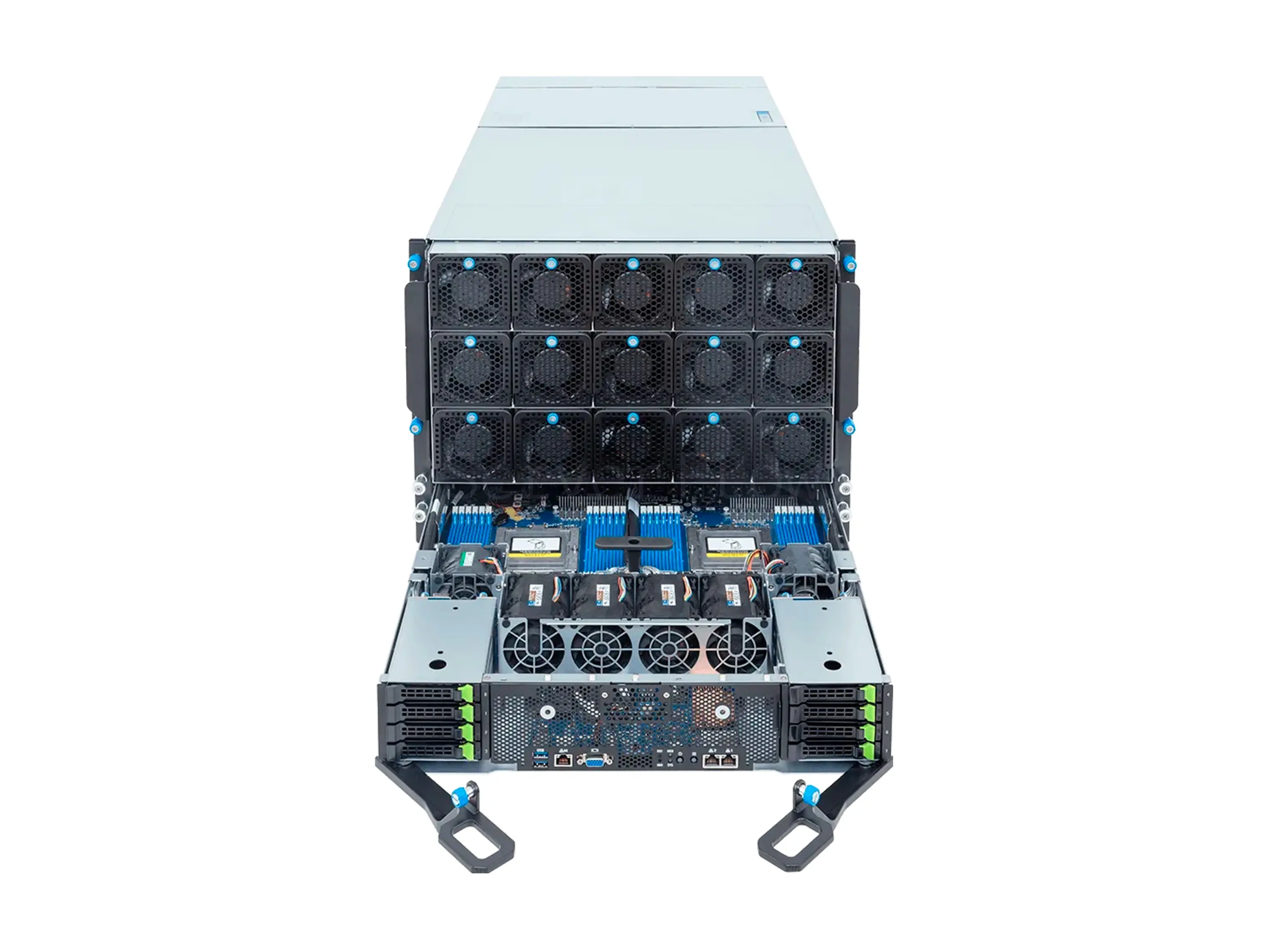 По I/O сервер ориентирован на масштабирование в кластере и высокую пропускную способность - предусмотрены 8 OSFP портов для GPU-сетей (InfiniBand XDR 800Gb/s или Dual 400GbE через NVIDIA ConnectX-8), а также фронтальные 2×10GbE и отдельные порты управления