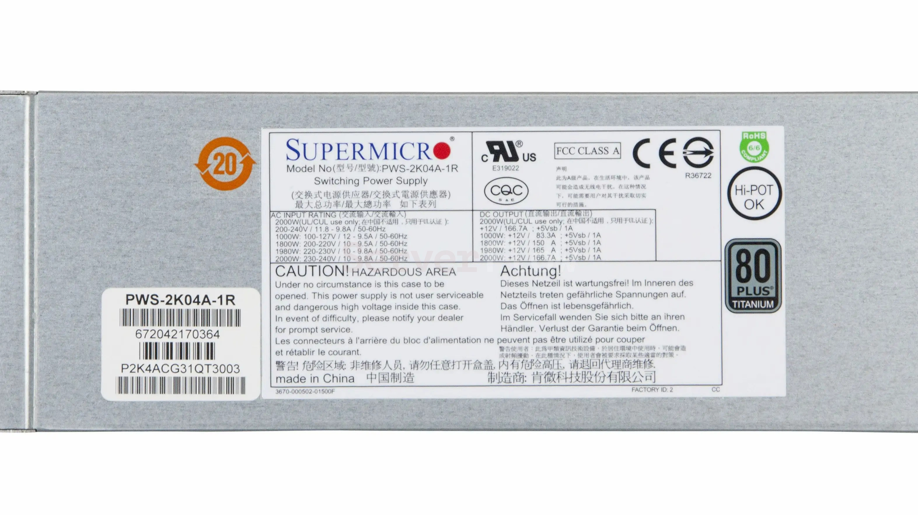 | Мощность блока питания, Вт | 2000W |