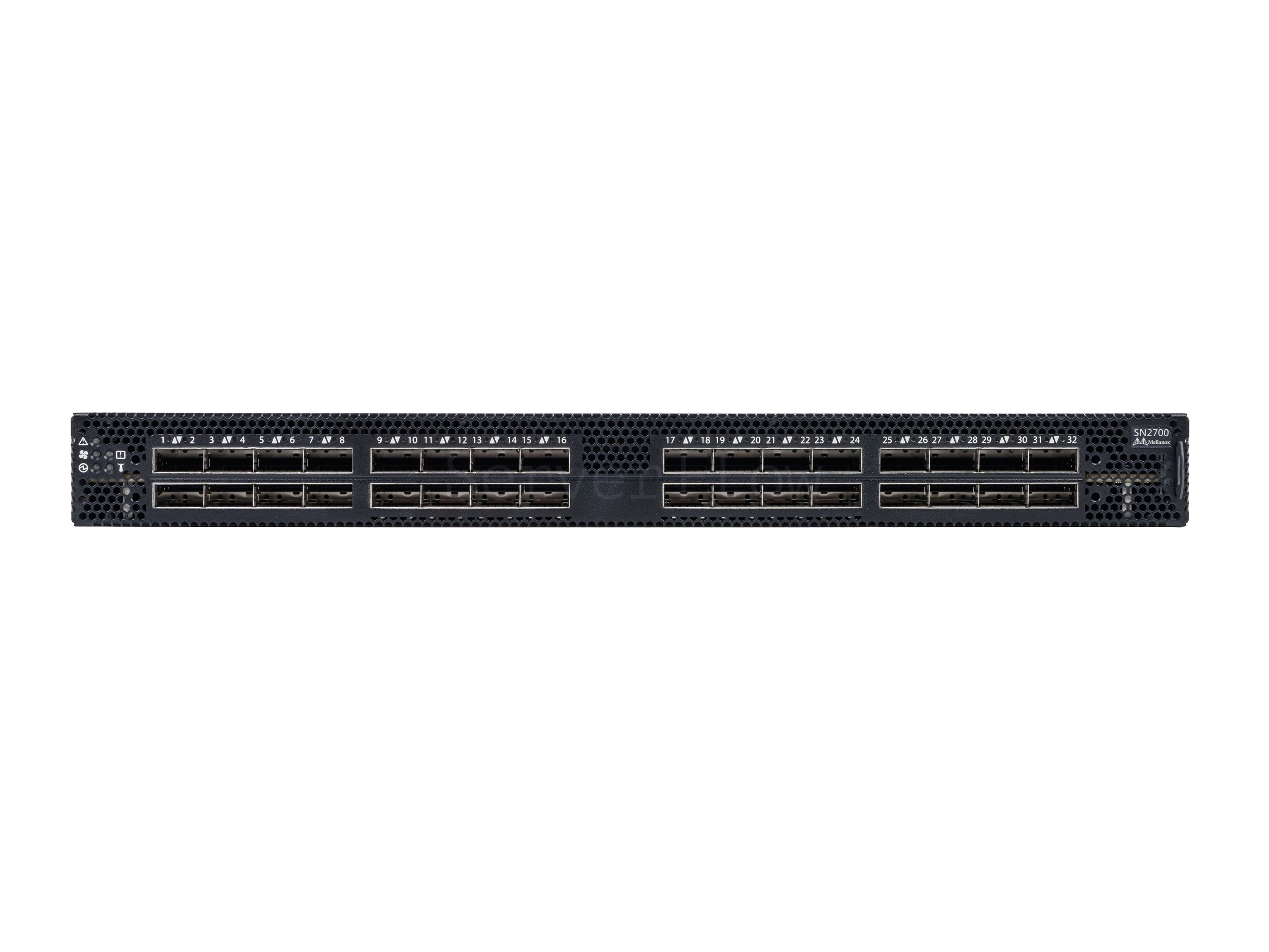 Модель оснащена 32 портами QSFP28, каждый из которых поддерживает скорости 1G, 10G, 25G, 40G, 50G, 56G и 100G. Порты QSFP28 используются как access и uplink в зависимости от конфигурации. Для управления предусмотрены два RJ-45 10/100/1000 Ethernet MNG-порта и один USB-консольный порт.